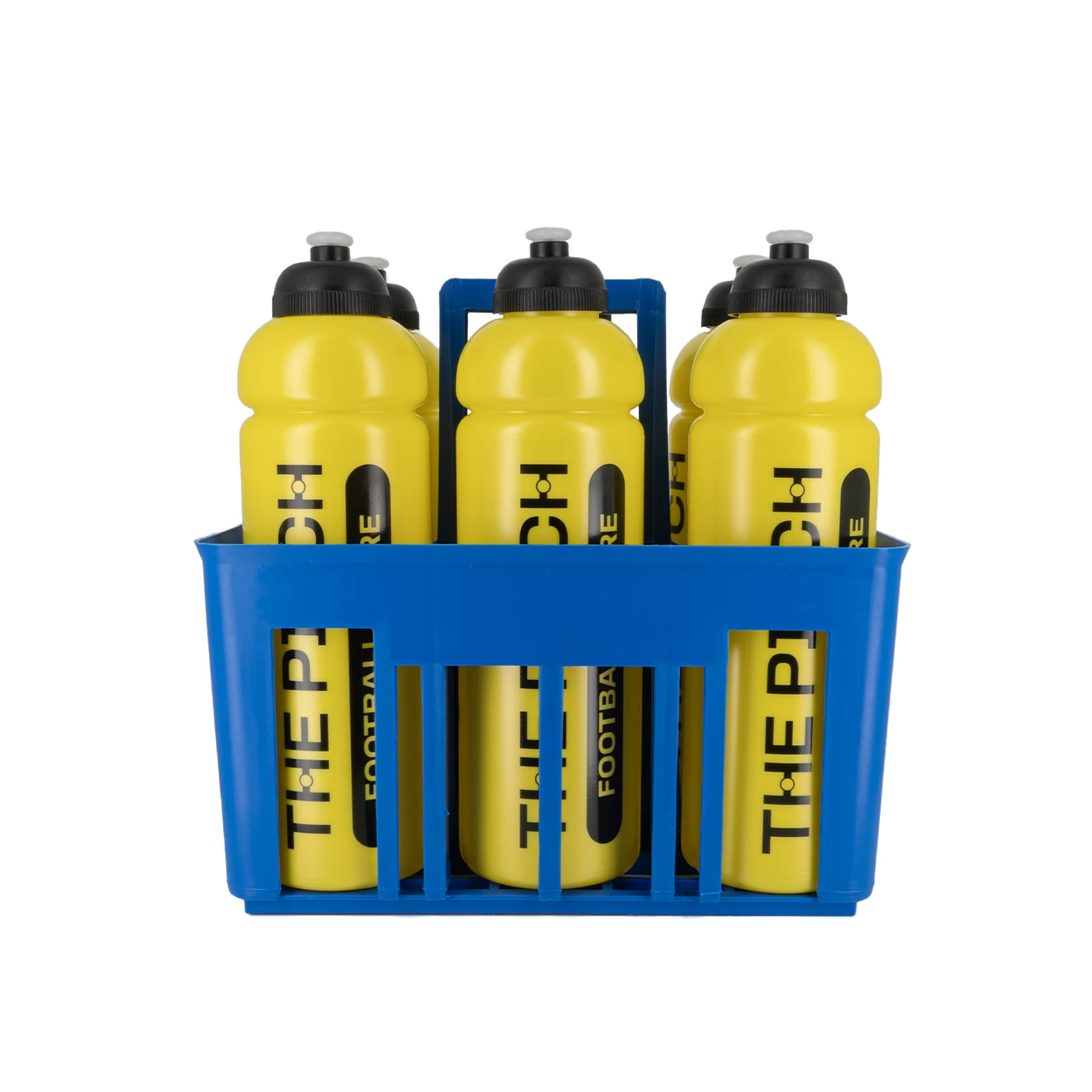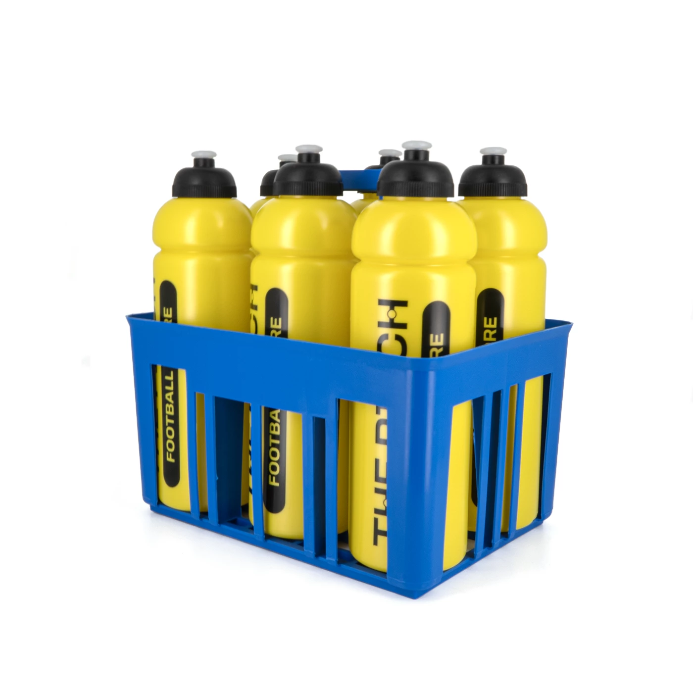 A basket containing 6 personalized thepitchfootball.com water bottles. Essential accessory to take on the bench.